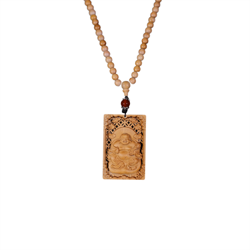雕工精致的老山檀弥勒佛雕刻牌,配上檀香圆珠项链。